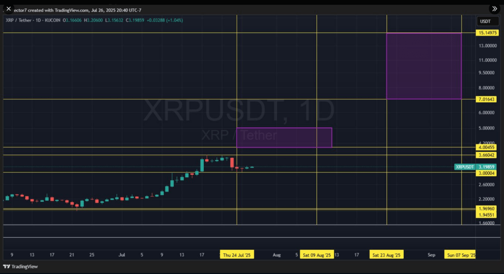 According to analyst Zach Rector, XRP has been trading in a narrow band just above $ 3.00. It recently sat around $ 3.15, giving it room to spring higher. Rector points out that a push above $ 3.25 could send XRP into the $ 4–$ 5 range “any day now.”