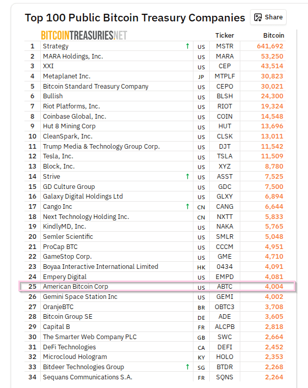The firm has expanded quickly after merging with Gryphon Digital Mining. According to Bitcoin Treasuries, ABTC is the 25th-largest public company holder of Bitcoin in the US.