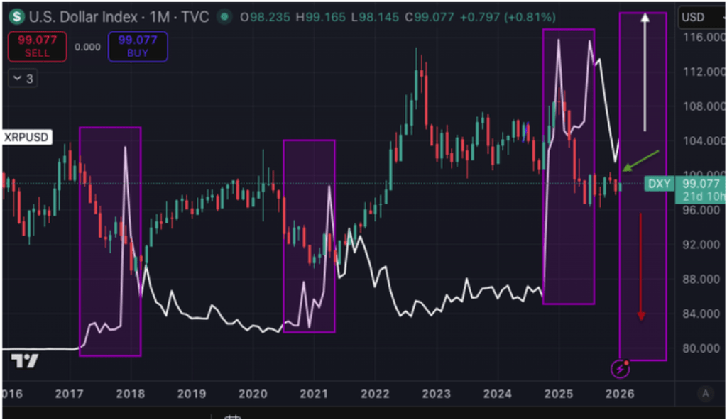 Bird’s analysis is based on the US Dollar Index, or DXY, and its inverse relationship with XRP during important phases. The chart accompanying his post pointed to three previous periods, around 2017, 2021, and 2024, where sustained weakness in the dollar coincided with aggressive upside moves in XRP.